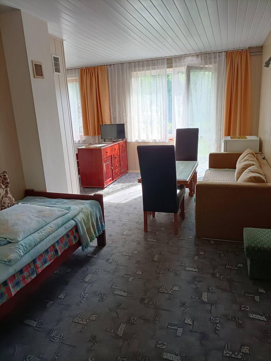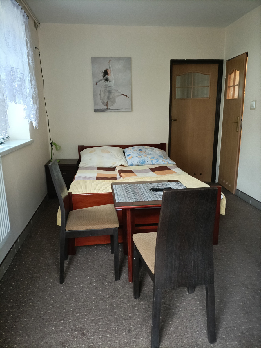 Pokój 2 osobowy łazienką i aneksem kuchennym.